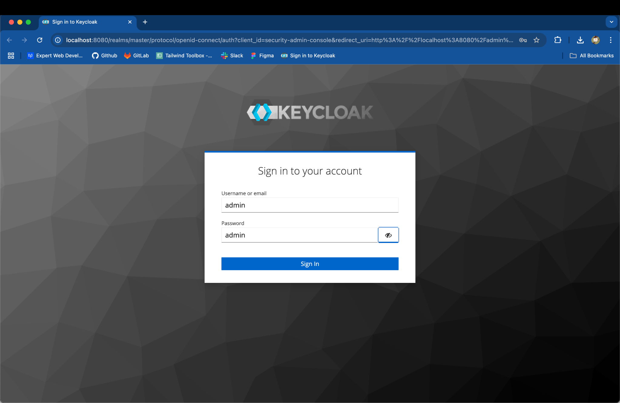 Access the Keycloak Admin Console: open http://localhost:8080 in your browser with admin credentials