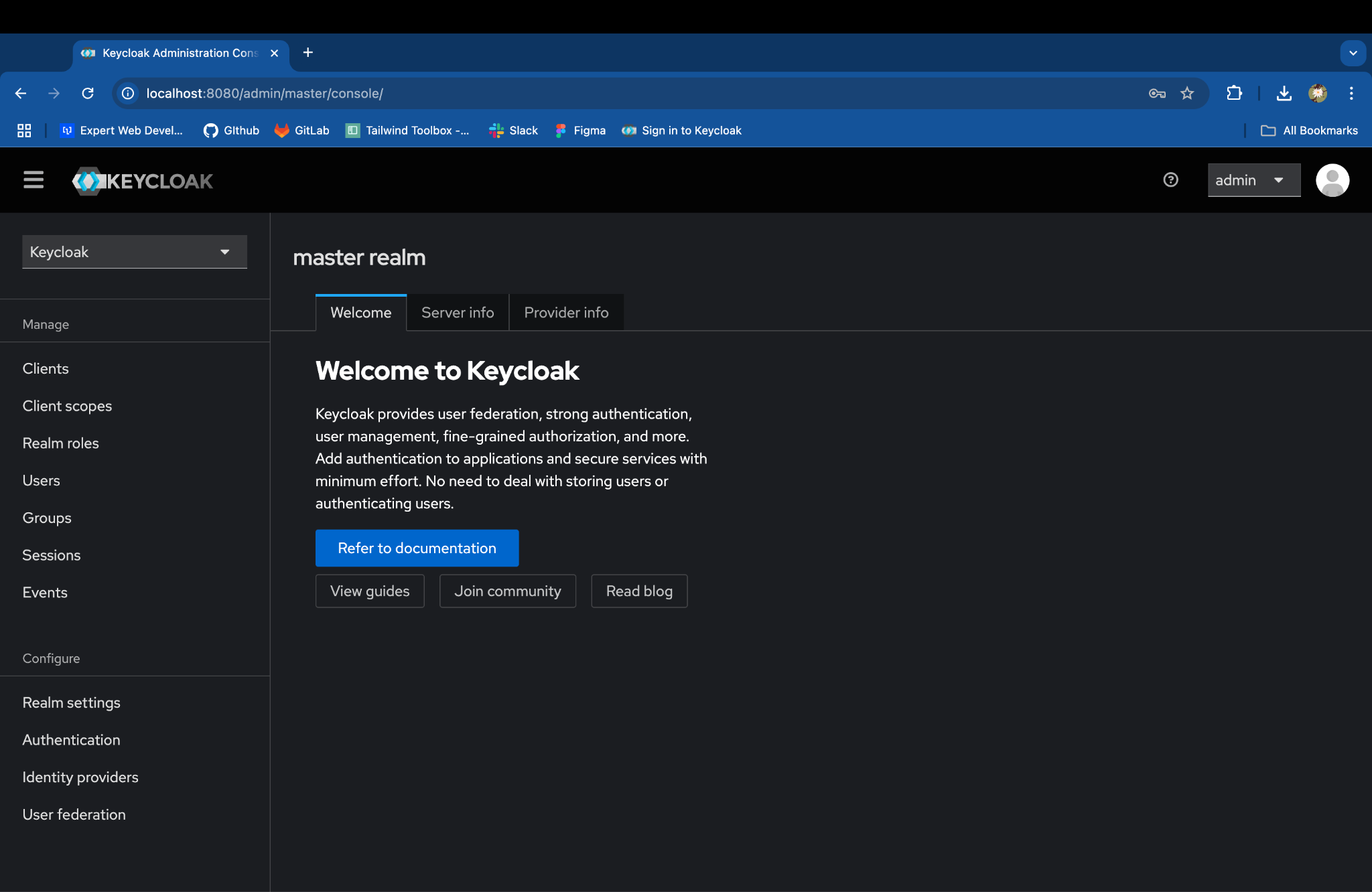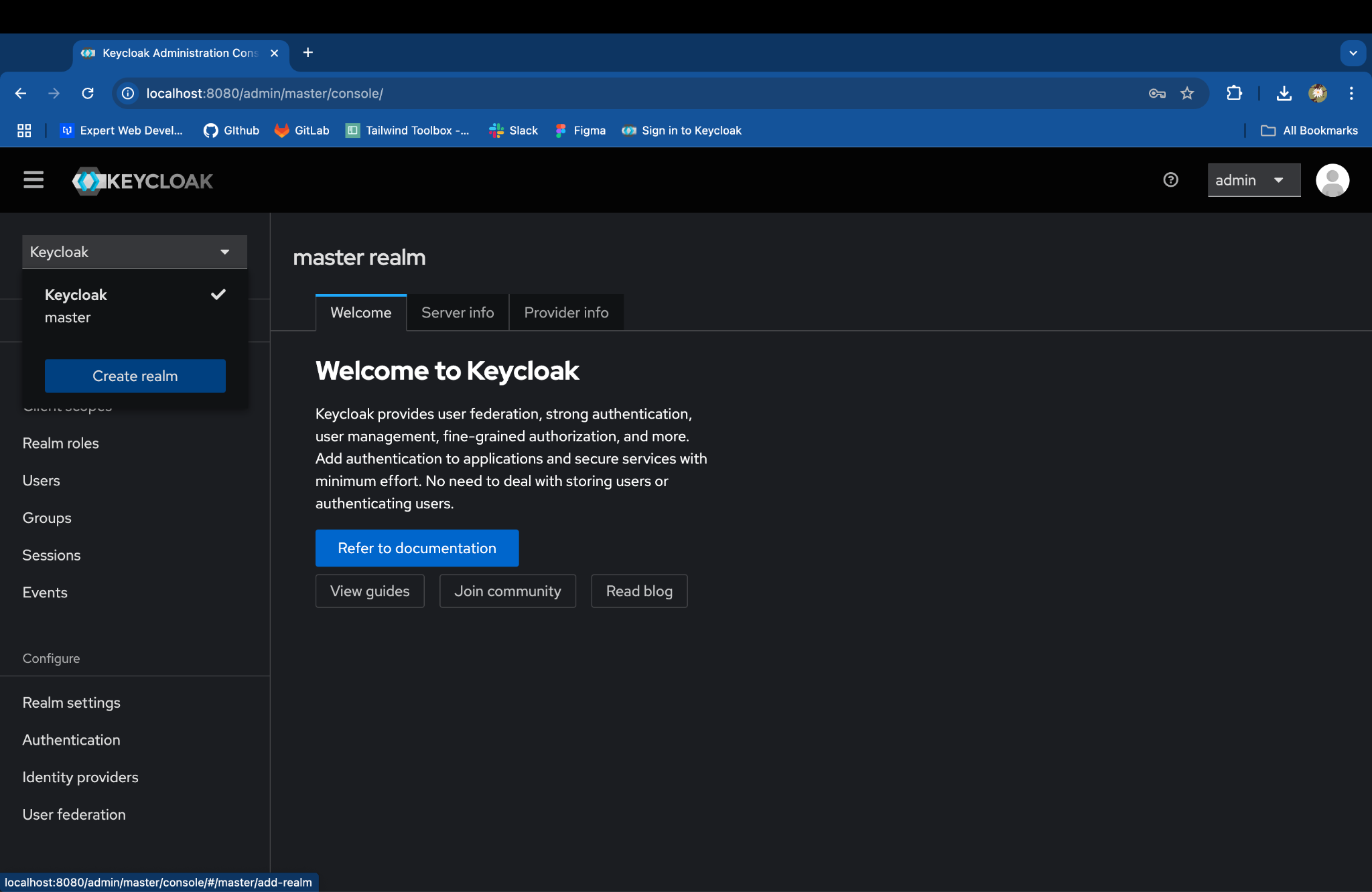 Keycloak server is up on http://localhost:8080, you can login with the default admin credentials: