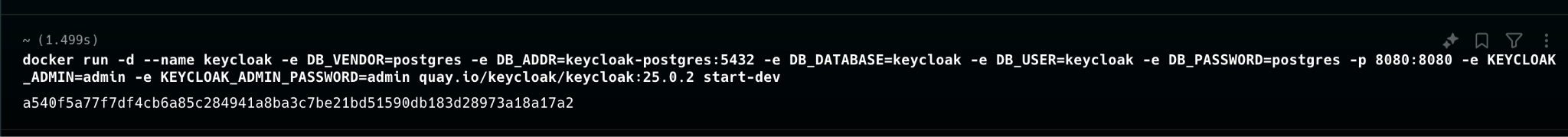 docker run -d --name keycloak -e DB_VENDOR=postgres -e DB_ADDR=keycloak-postgres:5432 -e DB_DATABASE=keycloak -e DB_USER=keycloak -e DB_PASSWORD=postgres -p 8080:8080 -e KEYCLOAK_ADMIN=admin -e KEYCLOAK_ADMIN_PASSWORD=admin quay.io/keycloak/keycloak:25.0.2 start-dev