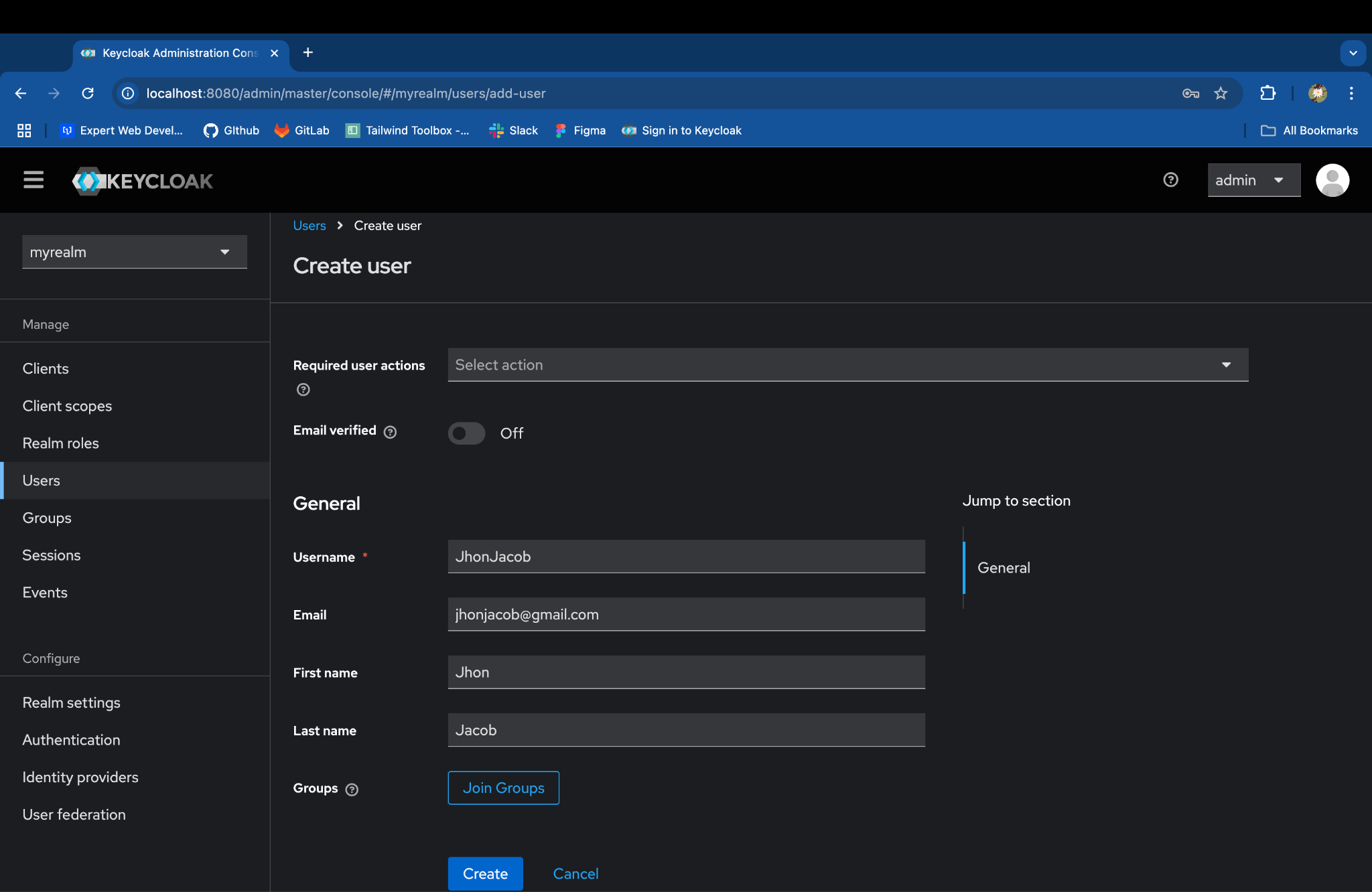 - Enter the Realm name & click on Create: myrealm